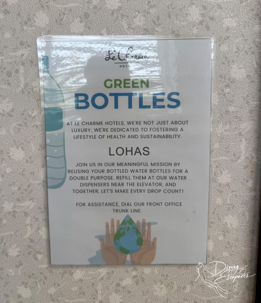 One detail I really appreciated was the water refill stations in the hallway, paired with clear messaging encouraging guests to reuse bottles.